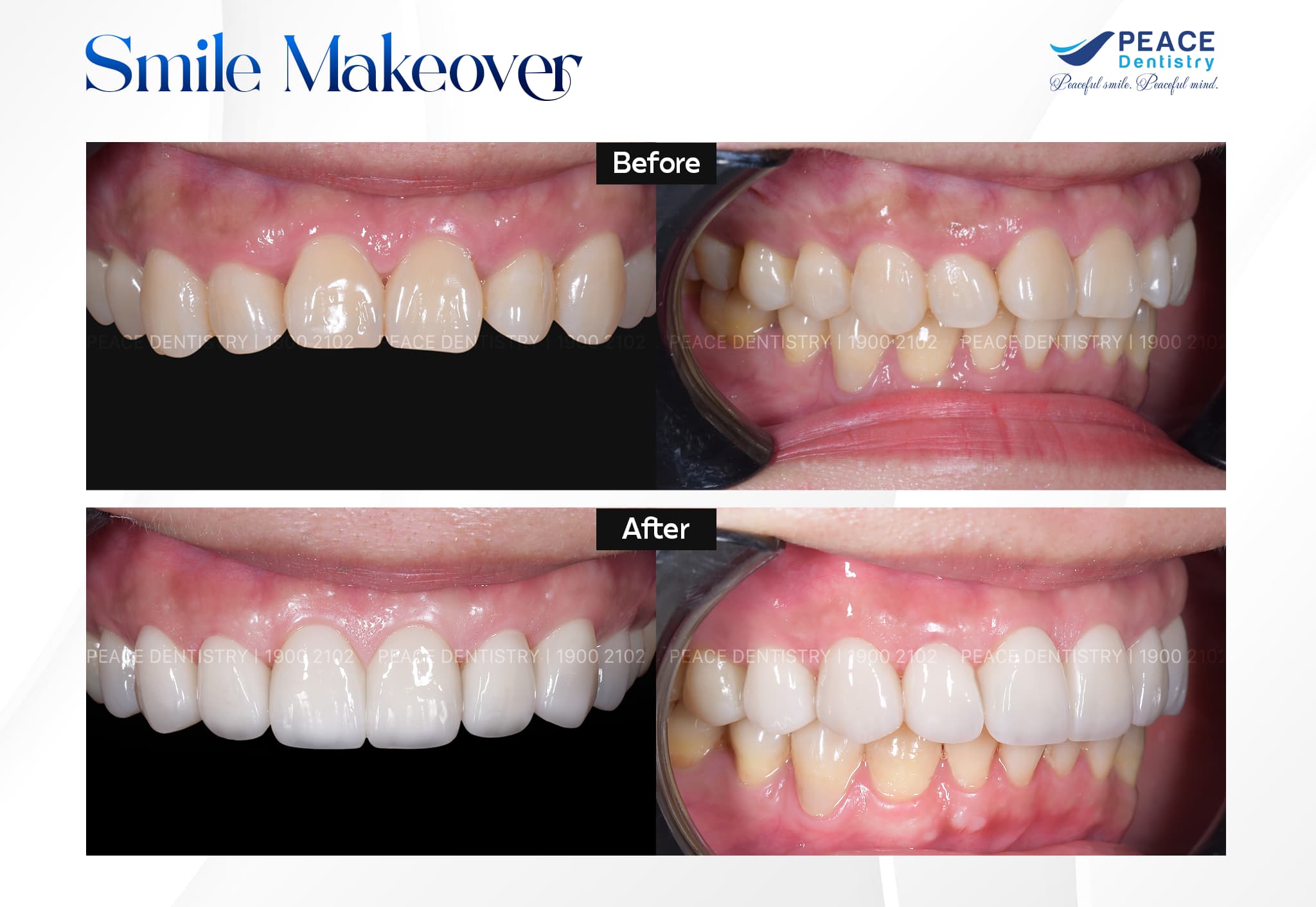 Khách hàng vô cùng hài lòng với nụ cười mới khiến chị trông tự tin hơn, diện mạo rạng rỡ, thu hút và nhận được nhiều lời khen ngợi từ bạn bè xung quanh. Tại Peace Dentistry, một kế hoạch điều trị đúng, bắt đầu từ việc bác sĩ thấu hiểu từng chi tiết nhỏ – nướu đến dáng răng, màu răng, từ mong muốn thẩm mỹ đến sự an toàn lâu dài.