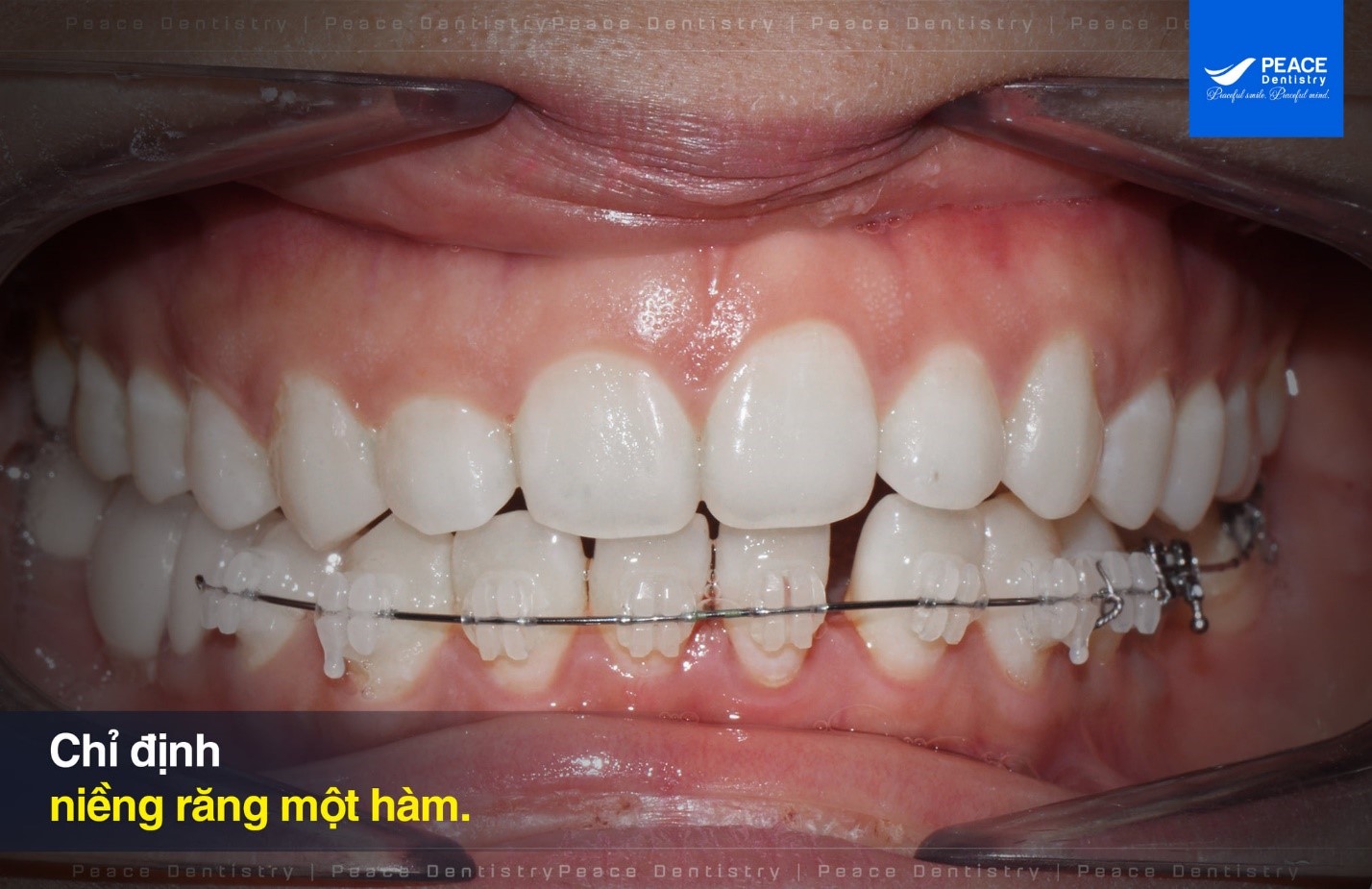 • Răng thưa và chỉ bị thưa trên 1 hàm (thường gặp nhất tại Peace Dentistry là thưa 2 răng cửa hàm trên) là một dạng khuyết điểm rất phổ biến và nó được khắc phục hiệu quả cao bằng niềng răng 1 hàm.