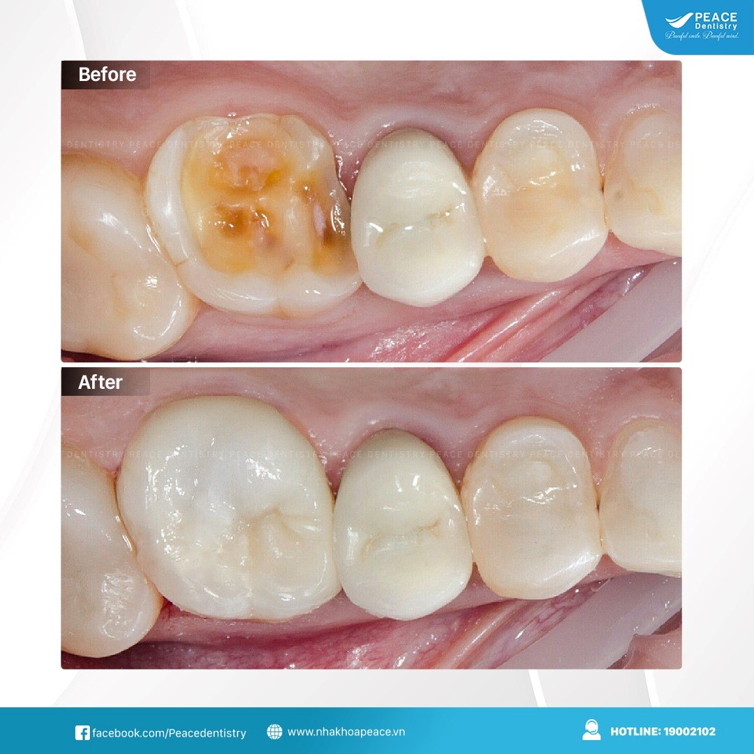 Tại Peace Dentistry, trám răng không chỉ dừng lại ở việc lấp đầy mô răng bị tổn thương mà còn đảm bảo yếu tố thẩm mỹ cao. Vật liệu được chọn kỹ lưỡng, tiệp màu với răng thật. Bác sĩ sẽ tạo hình viền nướu và đường viền miếng trám một cách tinh tế để răng trông tự nhiên nhất. Đồng thời kiểm tra kỹ khớp cắn để tránh tình trạng cộm, vướng sau khi hoàn tất.