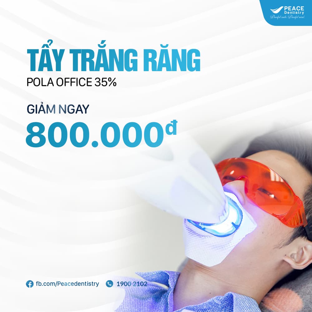 Sử dụng thuốc tẩy Pola Office 35% (Úc) của tập đoàn SDI (hàng đầu thế giới về sản xuất vật liệu nha khoa) là thuốc tẩy cho hiệu quả cao và đặc biệt là khả năng hạn chế ê buốt. Đây là thuốc tẩy có chứng chỉ lưu hành quốc tế, được chứng nhận và khuyên dùng bởi FDI.
