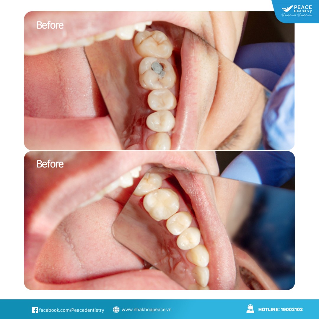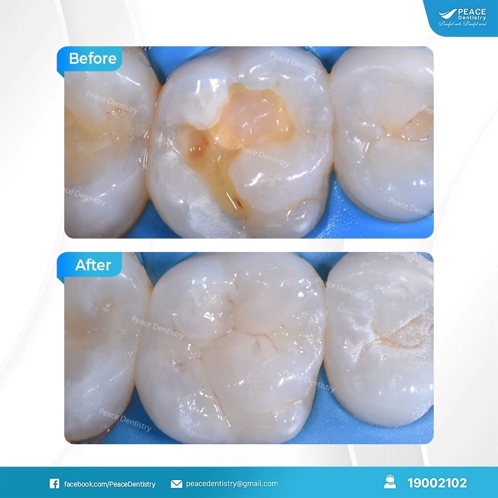 (Một trường hợp sâu răng vỡ lớn đã phục hình bằng phương pháp trám được thực hiện bởi bác sĩ Peace Dentistry)
